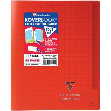 En savoir +Koverbook le cahier pratique et économique, véritable 2 en 1 avec sa couverture en plastique ainsi que ses 2 rabats faisant à la fois office de marque-pages et de pochettes de rangement ! Fourni avec 1 étiquette adhésive. Plus besoin de protège-cahier ! Couverture solide et protectrice en polypropylène transparent avec deux grands rabats à pochette pour marquer les pages et ranger les documents utiles ! Véritable 2 en 1 : cahier et protège-cahier à rabats Fourni avec 1 étiquette adhésive pour personnaliser le cahier (nom, prénom, matière, classe...) Papier Clairefontaine Vélin Velouté 90g, pour une sensation de glisse unique. Certifié PEFC, pour la gestion durable des forêts Fabriqué en France.