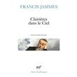 Le bonheur d'expression de Clairières est dans cette alliance fragile et toujours sauvegardée où Jammes situe son chant en demi-teinte. Comme il est dans une poésie qui dédaigne la métaphore pour une comparaison de forme élémentaire ( Comme un insecte, la faucheuse mécanique , Son clocher, comme un épi blanc , etc), qui accepte les adjectifs les plus conventionnels ( l'odeur des roses est terrible , et ainsi de suite), mais qui s'épanouit dans la complicité aux choses et aux êtres, qui se satisfait de leur simple dénomination et de leur énumération, qui ne raffine pas sur la sensation, qui la dit dans sa fraîcheur première, comme elle dit les joies et les peines telles qu'elles arrivent. Le sommet est atteint avec le Rosaire , où l'enfance, les simples, les animaux sont convoqués à l'élan de la prière qui s'élève vers Marie. Jammes ou la vie immédiate, Jammes ou l'évidence poétique. Au moment où Claudel entreprend ses Odes, il suit avec Clairières dans le Ciel une voie certes plus modeste, plus familière, mais comparable en fin de compte : n'est-ce pas, de part et d'autre, la même expérience d'une aventure spirituelle assumée par la poésie ? Michel Décaudin