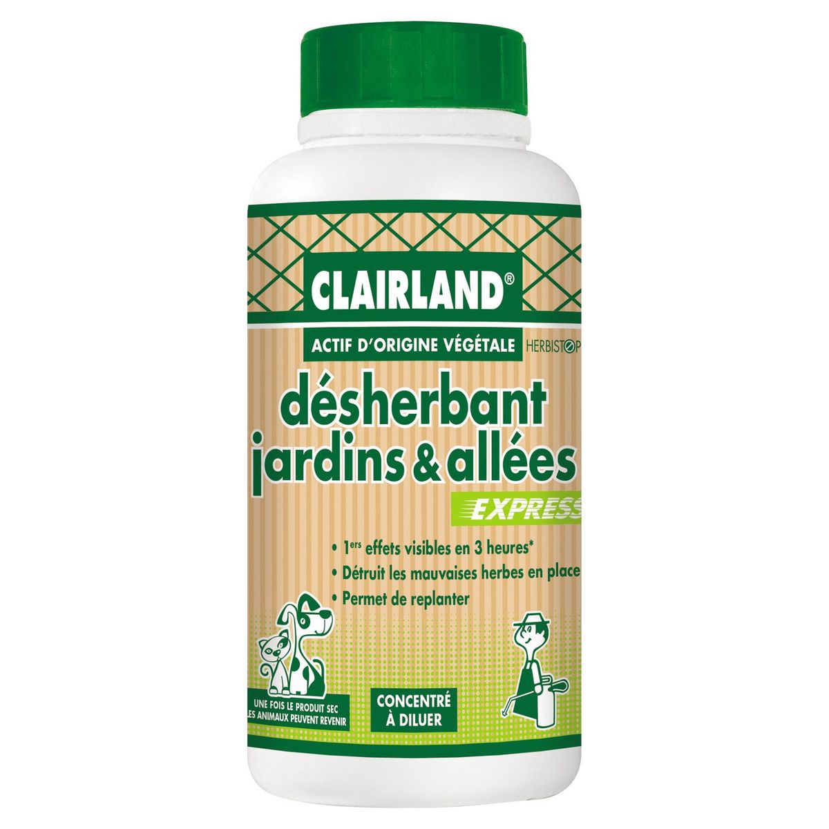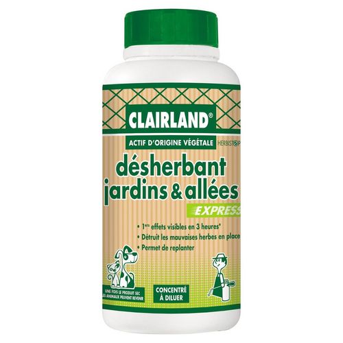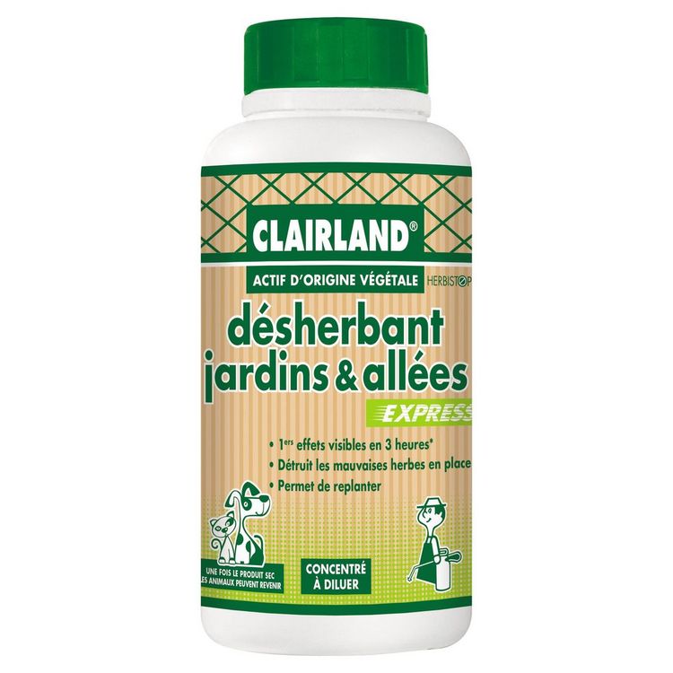 Désherbant Jardins & Allées Actif présent dans la nature Concentré 500 mL Désherbant de contact non sélectif destiné au désherbage des espaces cultivés ou plantés du jardin ainsi que sur vos allées et terrasses. Formulation INNOVANTE à base d'un principe actif présent dans la nature : L’acide pélargonique, existant notamment dans les géraniums. Détruit les mauvaises herbes en place avec un effet visible en moins de 3 heures. Retour rapide des animaux domestiques sur la surface traitée. Permet de replanter.