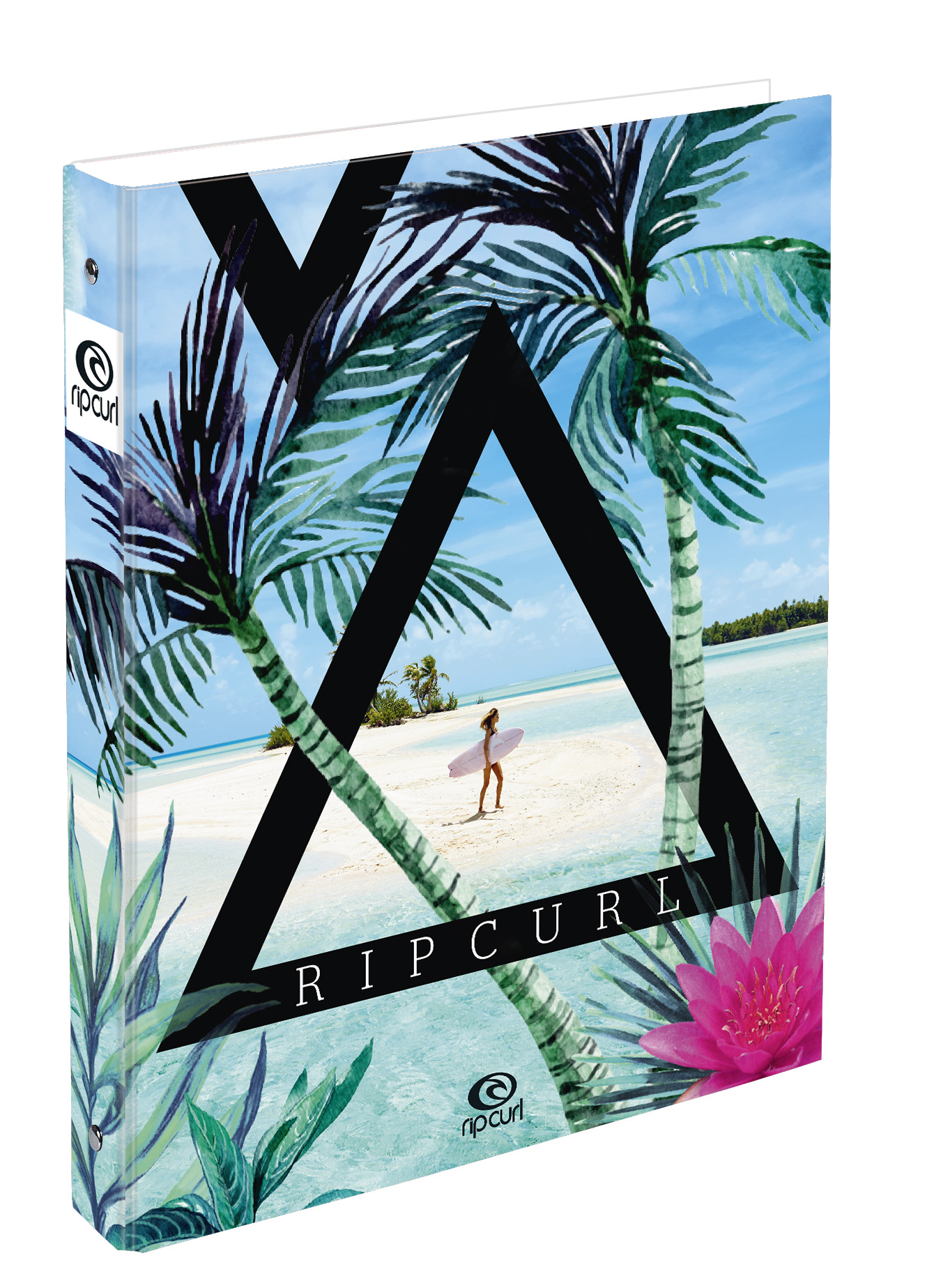 classeur dos de 40 mm 210x297 4 anneaux-diam 30-ecart 80 polypropylene opaque 7/10eme 4 visuels assortis carton presentoir rip-curl live the search oasis plage