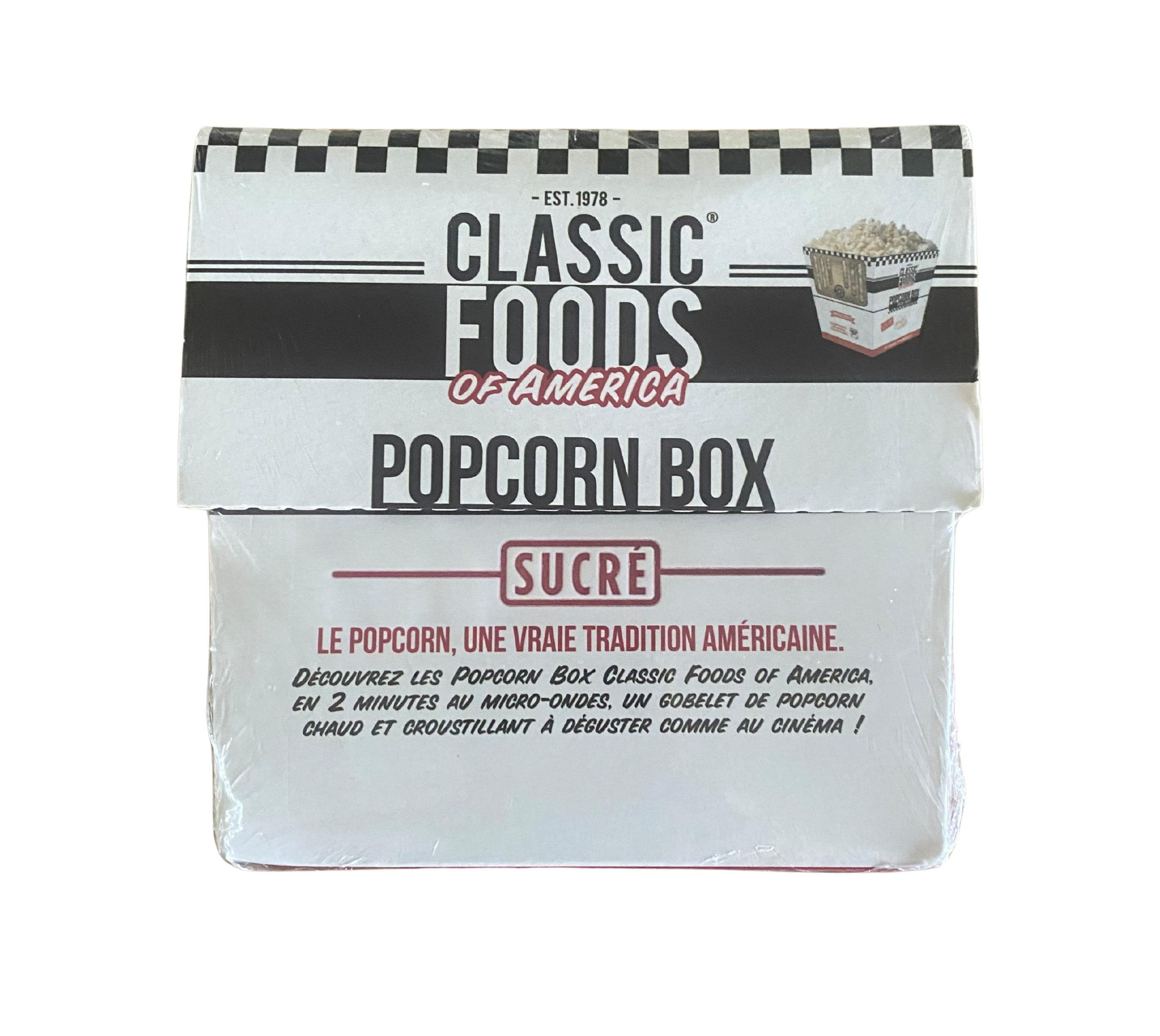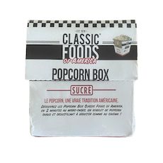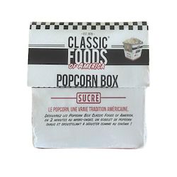 Offrez-vous une séance comme au cinéma avec la Popcorn box Classic Foods of America sucrée. Faîtes éclater le popcorn en plaçant le gobelet quelques minutes au micro-ondes. Chauds et croustillants, ils sont prêts à déguster. Installez-vous confortablement et bon film !