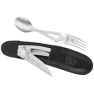 Claude Dozorme 8.90.221.91 Ce couteau de poche 8.90.221.91 de Claude Dozorme est à la fois une fourchette, une cuillère mais aussi un tournevis, un décapsuleur, un serre-écrous 3 formats (m6/m5/m4) et permet aussi de couper une ficelle grâce à sa micro-denture latérale. Elle est parfaite pour les repas en extérieur au design épuré s'ouvre d'une seule main et possède le système sécurisant Liner Lock qui bloque la lame une fois déplié. Fabriqué en acier inoxydable de très haut de gamme à 0.50% de carbone, 15% chrome, et 1% de molybdène et vanadium pour lui donner un tranchant.