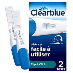 Le test de grossesse Clearblue® Flip & Click est un test de grossesse pliable de taille standard, doté d'une longue poignée pliante ergonomique et d'une tige extra-large à changement de couleur qui se colore en rose en cas d'absorption d'urine, pour vous indiquer que vous avez bien touché la cible. Ce test de grossesse intègre notre technologie unique Floodguard™ permettant de réduire la première cause d'erreur d'utilisation de plus de 70 %, en empêchant tout excès d'urine de venir trop imbiber la bandelette de test. Il est fiable à plus de 99 % à partir du jour où vous prévoyez vos règles[2], et fournit un résultat facile à lire, clair, plus (+) ou moins (-) en 3 minutes. Ce test est très sensible, vous pouvez l'utiliser 5 jours avant vos retards de règles[3] (ce qui correspond à 4 jours avant la date présumée de vos règles). Clearblue® : des résultats auxquels vous pouvez vous fier. Le test de grossesse Clearblue Flip & Click est un test de grossesse fabriqué par SPD Swiss Precision Diagnostics GmBH. Ce dispositif médical de diagnostic in vitro est un produit de santé réglementé qui porte, au titre de cette réglementation, le marquage CE. Lire attentivement la notice et demander conseil à un professionnel de santé. N° interne de référencement : 24/07/PROCTER/GP/001. Date de réalisation : 23 septembre 2024. Pour usage personnel à domicile, pour diagnostic in vitro uniquement. Garder hors de portée des enfants. Ne pas réutiliser les bâtonnets-tests. Conserver entre 2 et 30 °C. [1] Données internes. [2] Détection précise de la grossesse à plus de 99 % à partir du jour où vous prévoyez vos règles. Précision supérieure à 99 % pour la détection des taux typiques d'hormone de grossesse. Notez que les taux hormonaux varient. Voir notice. [3] 56 % des résultats de grossesse peuvent être détectés 5 jours avant vos retards de règles. [4] La sensibilité du test est de 25 mUI/ml.