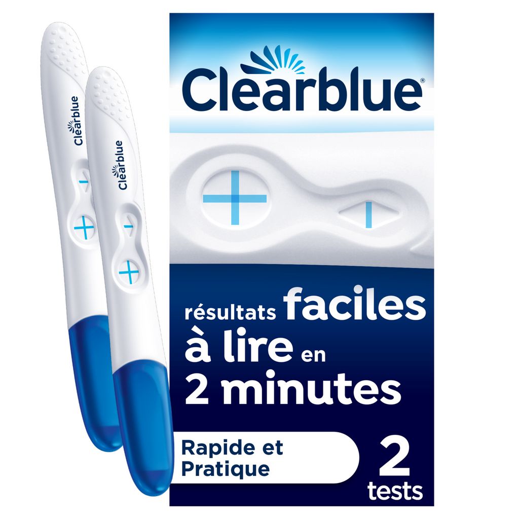 Le Test de grossesse Clearblue Pratique et Rapide est aussi fiable qu'un test urinaire réalisé chez le médecin (1). Avec ce kit de test de grossesse à domicile, vous pouvez faire un test jusqu'à 5 jours avant le retard de vos règles, c'est-à-dire 4 jours avant la date présumée de vos règles (2). L'extrémité absorbante devient rose pour vous indiquer que vous l'avez correctement imbibée d'urine et les résultats plus (+) ou moins (-) apparaissent en seulement 2 minutes. Pour plus d'informations sur ce produit ou pour obtenir des réponses à vos questions, contactez les conseillères de notre assistance téléphonique, qui se tiennent à votre disposition de 8 h à 16 h du lundi au vendredi, hors jours fériés : 0 805 540 267. (1) Fiable à plus de 99 %* dès la date présumée de vos règles. *Notice d'utilisation en référence. (2) La date de retard des règles correspond au lendemain de la date présumée de vos règles. Pratique et Rapide : 53 % des résultats Enceinte peuvent être détectés 5 jours avant le retard de vos règles. (3) Étude portant sur 111 femmes utilisant et lisant différents types de tests.