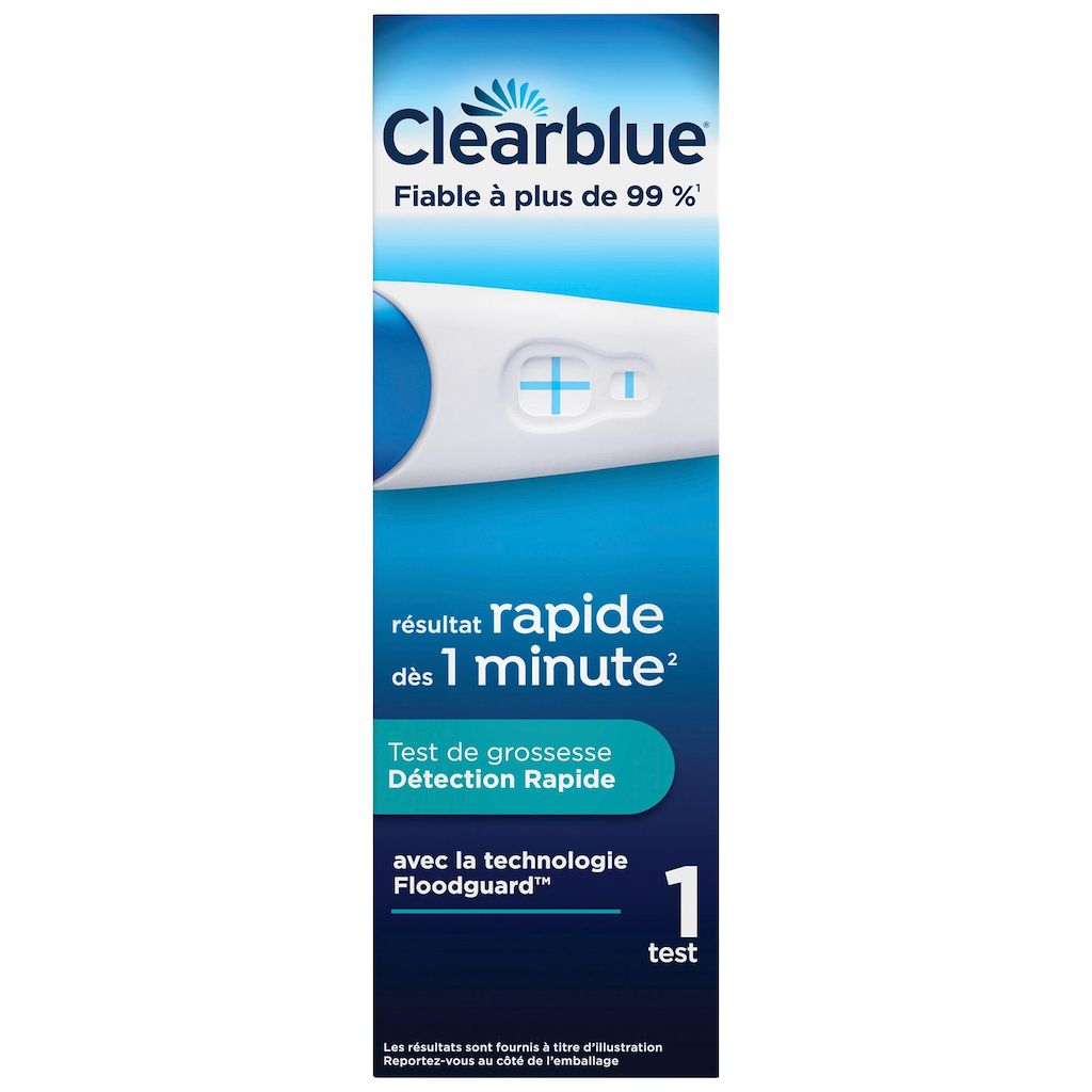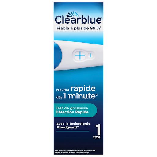 Le test de grossesse Clearblue Détection Rapide est conçu pour être le test de grossesse à domicile le plus facile à utiliser, grâce à sa large tige contrôle et sa poignée ergonomique. Avec la précision attendue de Clearblue, vous pouvez obtenir un résultat en 1 minute*. Un résultat « Enceinte » peut s'afficher en une minute seulement lorsque le test est effectué dès le premier jour de retard des règles. Vous devez attendre 3 minutes pour confirmer un résultat « Pas enceinte ». Il est fiable à plus de 99 % dès la date présumée de vos règles* et peut être utilisé jusqu'à 5 jours avant votre retard de règles (soit 4 jours avant la date présumée des règles). Lors de tests en laboratoire, les taux de détection de la grossesse étaient les suivants : 98 % un jour avant la date présumée des règles, 97 % 2 jours avant, 88 % 3 jours avant et 56 % 4 jours avant la date présumée des règles. Dans une étude britannique, plus de 9 femmes sur 10 ont déclaré vouloir payer plus pour Clearblue Détection Rapide que pour une bandelette de test (basée sur 111 femmes utilisant et lisant différents types de tests).