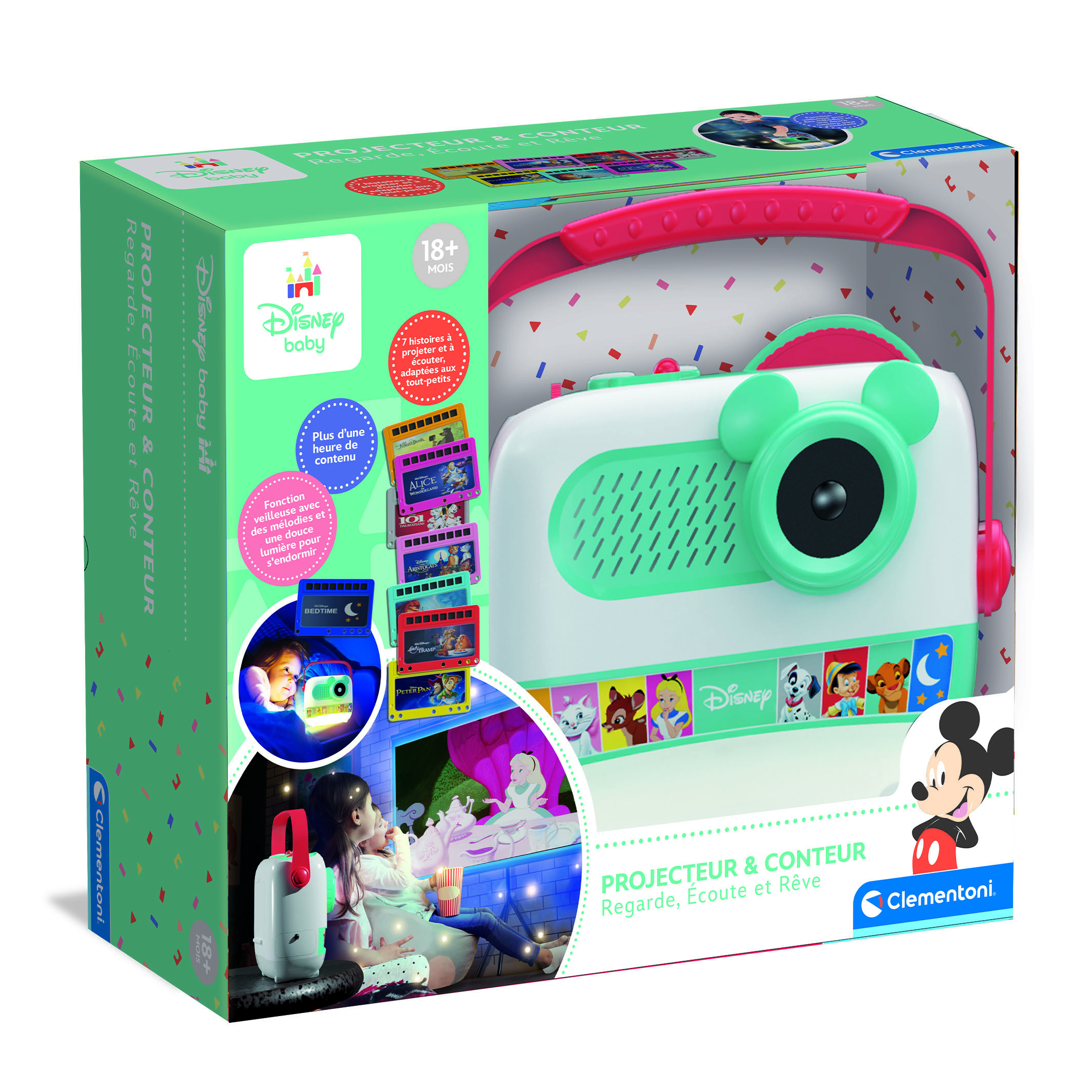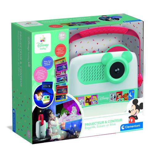 Le Projecteur & Conteur d'histoires Disney Baby de Clementoni est un jouet innovant conçu pour les enfants dès 18 mois. Il propose huit histoires captivantes avec un projecteur multicolore qui diffuse des images colorées sur les murs, accompagnées d'un haut-parleur intégré pour raconter les histoires. Ce produit stimule le développement de l'imagination des jeunes enfants et crée un moment de partage en famille. Fabriqué en plastique durable, il mesure 22,4 cm de large, 9,4 cm de haut, et 26 cm de long, avec un poids de 0.58 kg. Le jouet est idéal pour l'éveil et le divertissement éducatif.