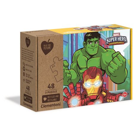 Un coffret contenant trois puzzles de 48 pièces de dimensions 32 x 22 cm, à l'effigie des personnages préférés des enfants. Fabriqué à partir de matériaux 100% recyclés.