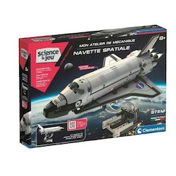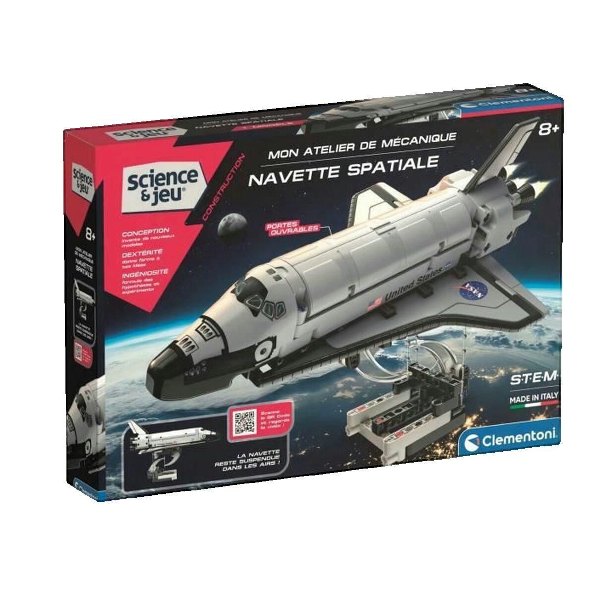 Le jeu de construction Navette Spatiale Tension de la marque Clementoni permet aux enfants de construire une navette spatiale détaillée et interactive avec effet de tension. Les caractéristiques incluent des ailerons réglables, une porte cargo ouvrante et un bras robotisé inspiré des outils utilisés