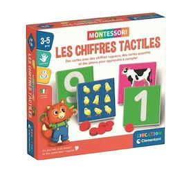 Le jeu éducatif 'Les chiffres tactiles' de Clementoni est conçu pour les enfants à partir de 3 ans. Il comprend 10 cartes rugueuses qui permettent aux enfants de reconnaître les chiffres par le toucher. Ce jeu stimule la pensée numérique grâce à des cartes de quantité et des jetons inclus. Les enfan