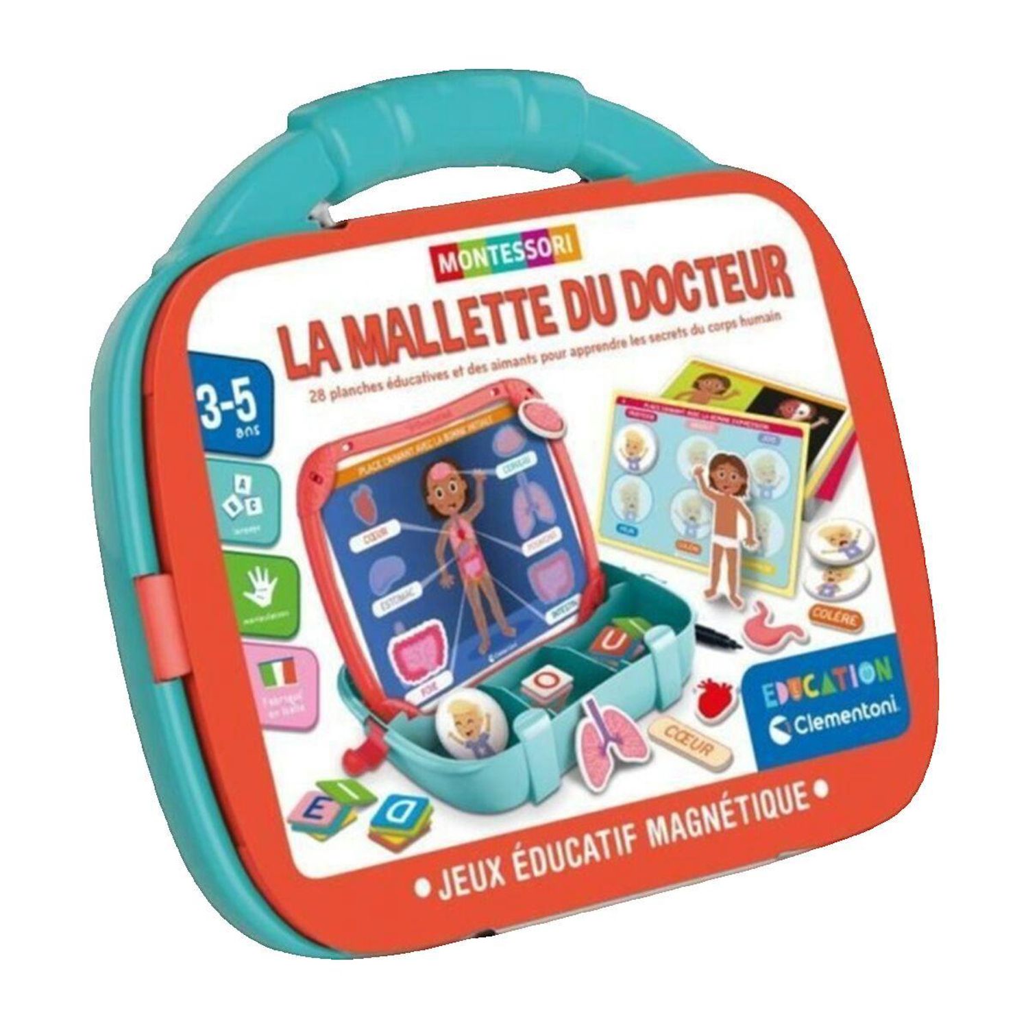 La Mallette Éducative Clementoni est un jeu éducatif magnétique conçu pour aider les enfants à explorer le corps humain et à comprendre les émotions de manière ludique. Elle comprend des pièces magnétiques représentant les os, les muscles, les organes et les émotions, ainsi qu'un livret pédagogique