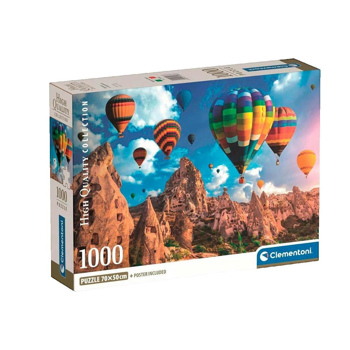 Découvrez le puzzle Clementoni Compact de 1000 pièces intitulé 'Balloons in Cappadocia'. Ce puzzle artistique mesure 70 x 50 cm une fois assemblé et offre une image captivante représentant des montgolfières en Cappadoce. Il est livré avec un poster d'aide pour faciliter l'assemblage. Fabriqué en Ita
