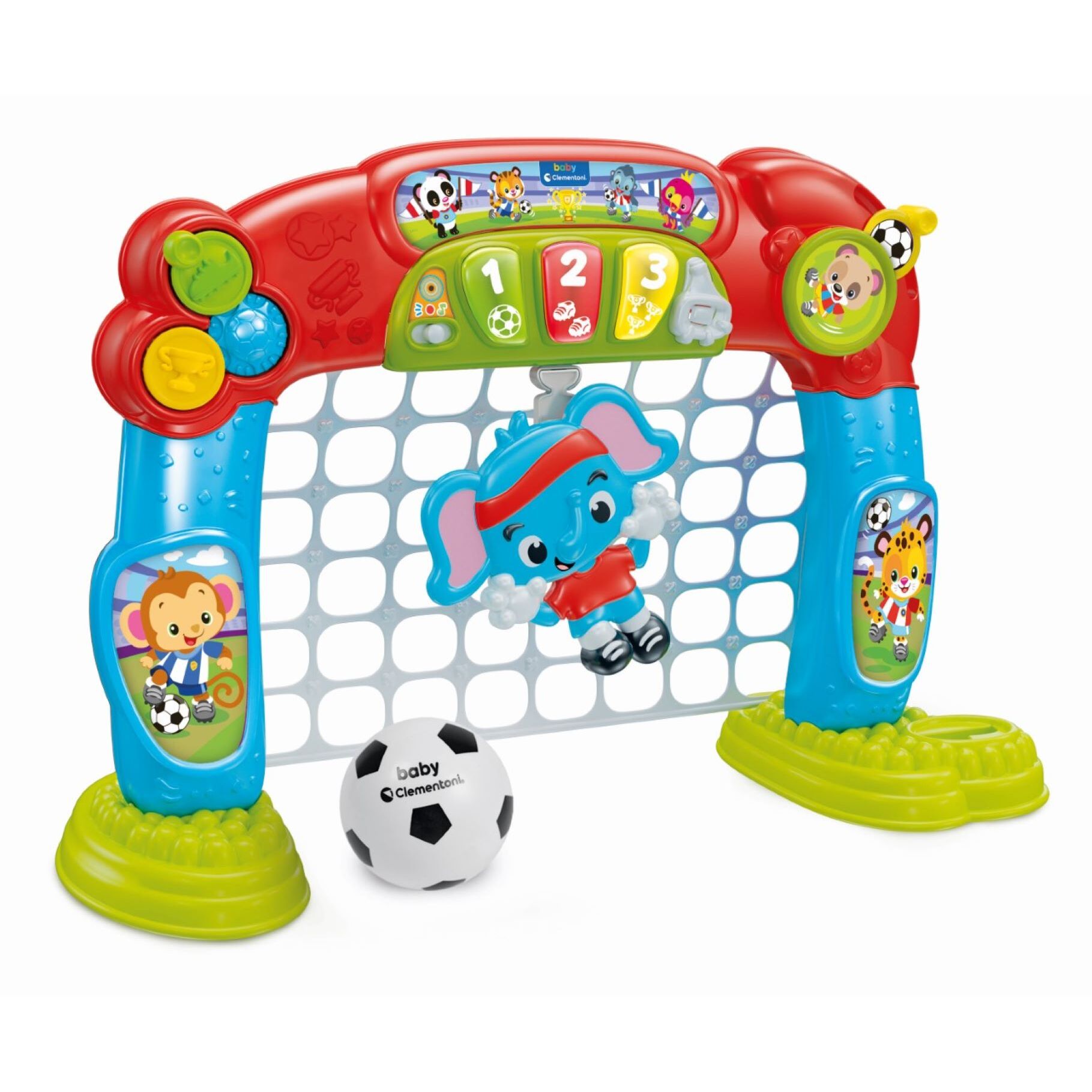 • Le coup d'envoi est sifflé ! Avec ce but de football, qui est aussi un centre d'activités, le plaisir s'invite sur le terrain !• Avec des effets sonores et lumineux pour capter l'attention de l'enfant et le guider dans le jeu, mais aussi des activités mécaniques.• Avec des boutons colorés et lumineux qui activent des chansons pour guider l'enfant dans des expériences de jeu engageantes et interactives.• Avec la balle en caoutchouc souple, adaptée à la taille des petits joueurs, ce sera un plaisir de marquer ! Lorsque le ballon touche son filet, ton compagnon de jeu compte les buts et applaudit tout en émettant des effets sonores amusants.• L'enfant sera encouragé à compter et à continuer à jouer pour s'amuser et apprendre. Il est aussi possible de retirer le gardien de but et de jouer librement.