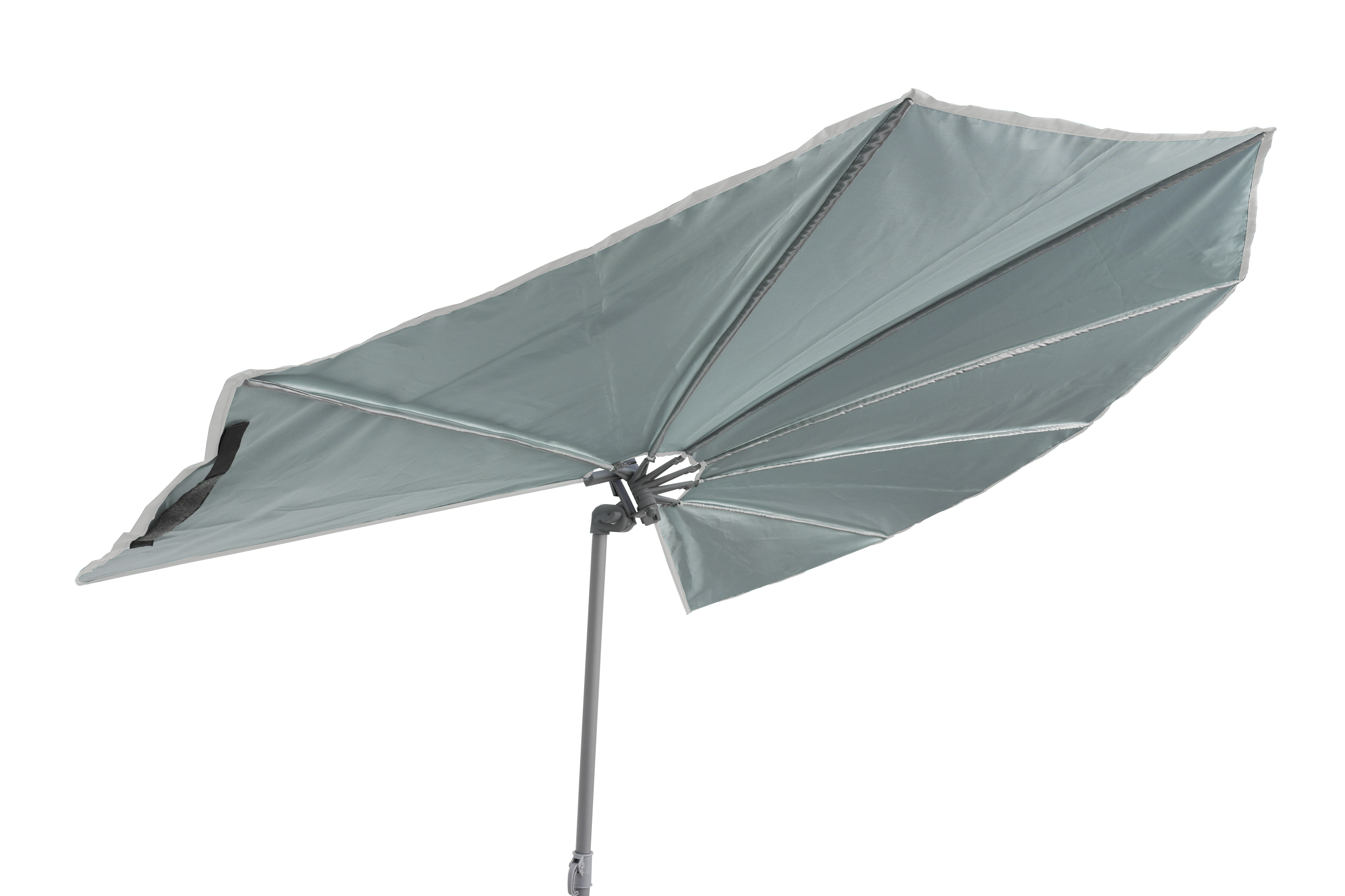 Le parasol est doté d'un système anti-vent grâce à sa structure souple et ses baleines en fibre de verre. Sa toile est traitée pour résister aux UV (UPF 50+). Son mat est déporté, et le parasol est inclinable dans toutes les positions. Le parasol est livré avec son sac de transport.