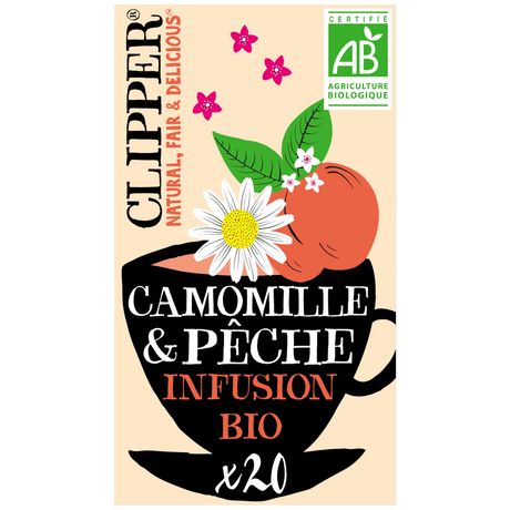 Découvrez l'infusion camomille pêche Clipper, ce mélange étonnant et irrésistible associe le gout floral de la camomille à la saveur fruitée de la pêche pour vous offrir une infusion délicieusement surprenante. Bio et naturellement sans caféine, cette tisane est votre alliée bien être.