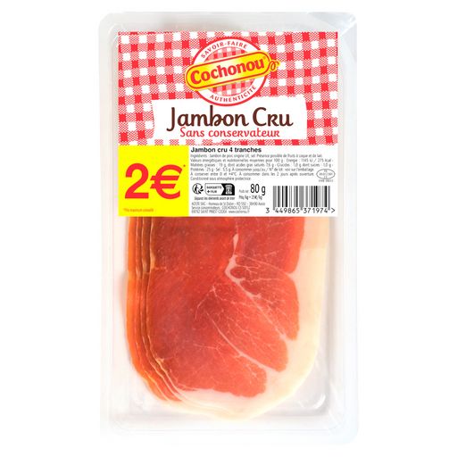 Cochonou met tout son savoir-faire dans ces tranches de jambon cru, fabriquées en Rhône-Alpes, sans conservateur. Ces tranches fines raviront vos convives comme votre famille !