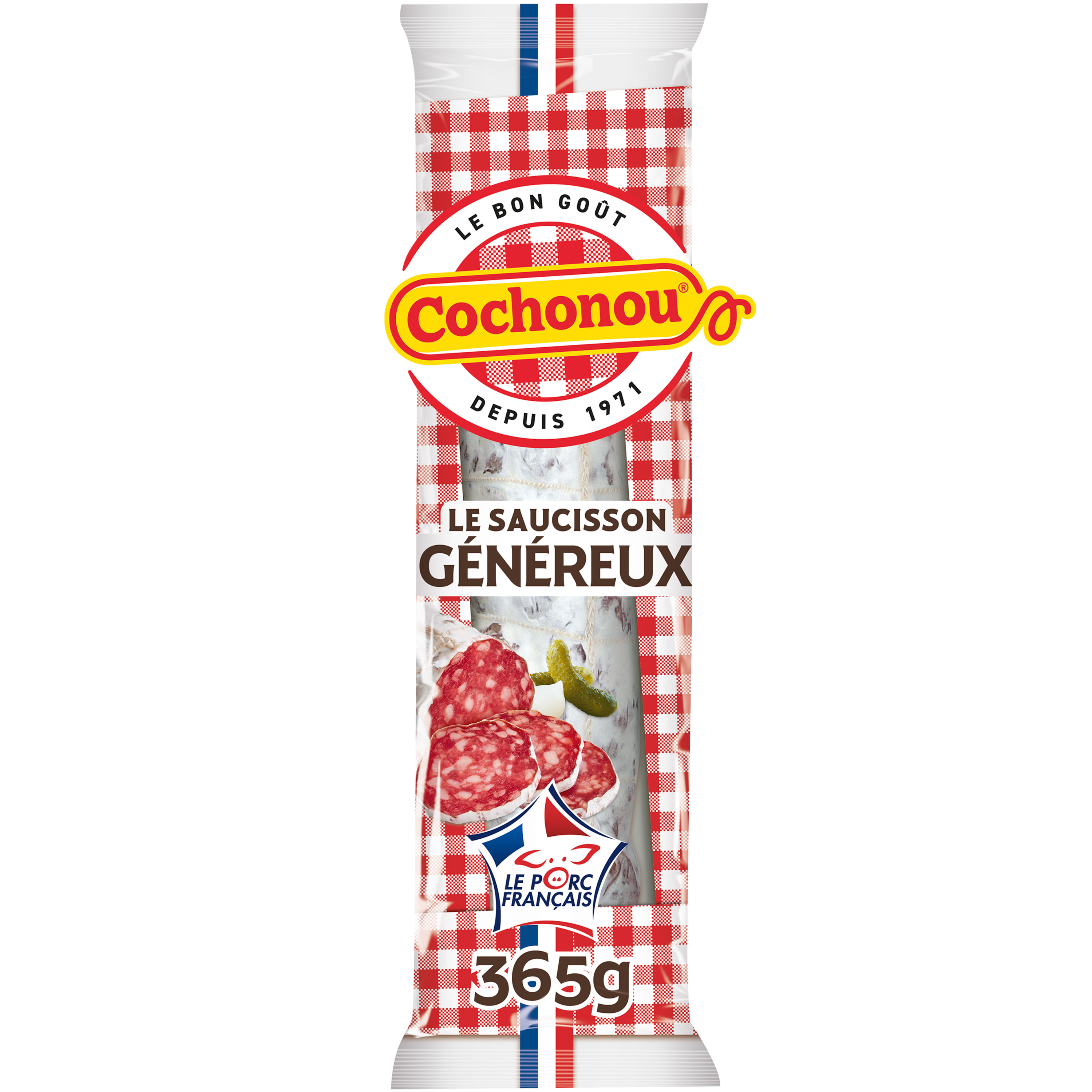 Cochonou met tout son savoir-faire dans ce saucisson sec qualité supérieure, fabriqué en Rhône-Alpes avec de la viande de porcs certifiés VPF, nés, élevés et abattus en France. Pour les gourmands et les grandes tablées, le Généreux Cochonou est l’allié de vos moments de convivialité.