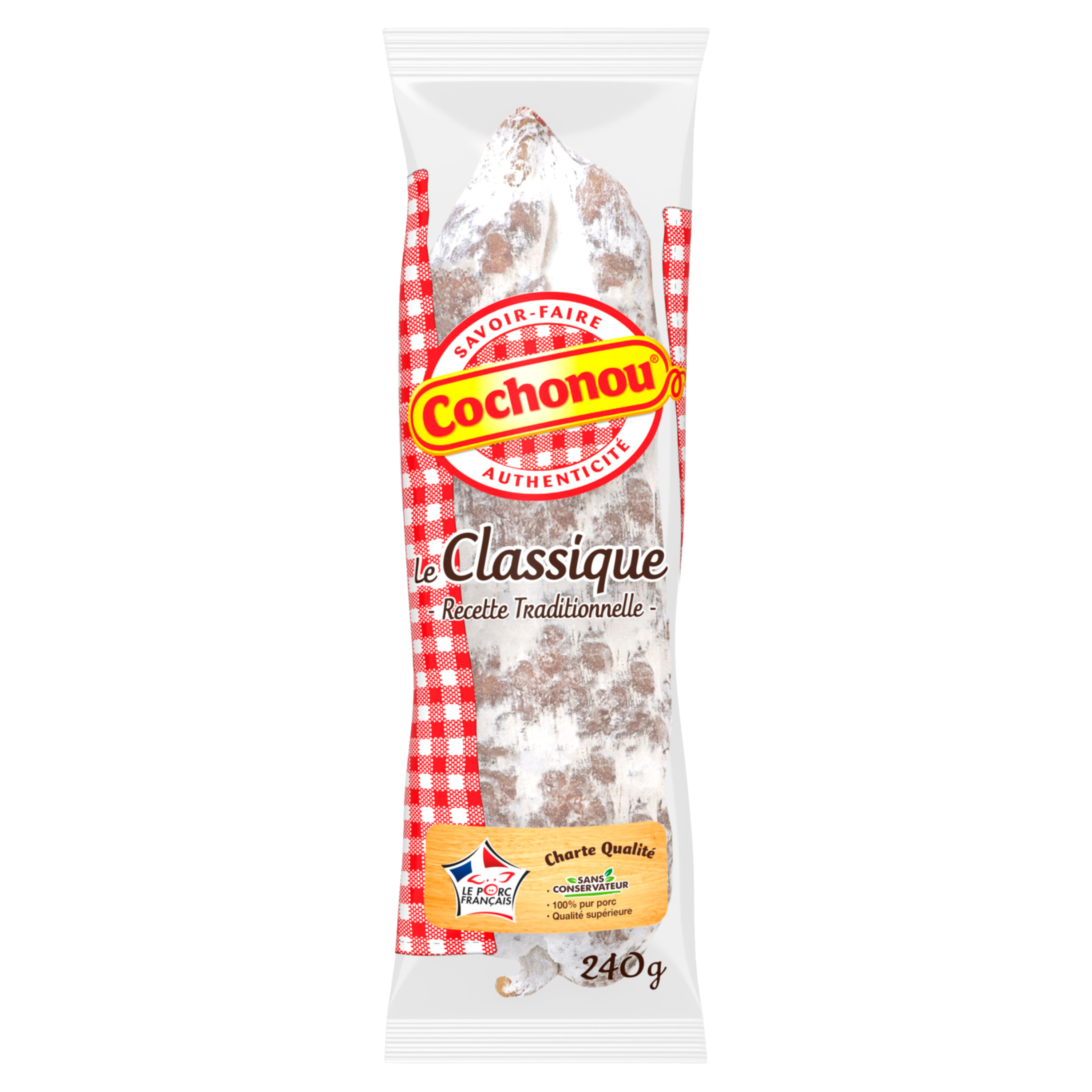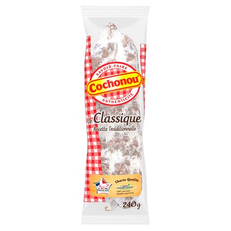 Saucisson sec qualité supérieure Cochonou met tout son savoir-faire dans ce saucisson de qualité supérieure 100% pur porc, fabriqué en Rhône-Alpes avec de la viande de porcs VPF, nés, élevés et abattus en France