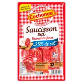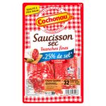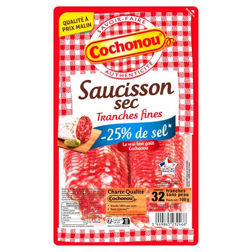 Pour un plaisir sans compromis, Cochonou vous propose ces tranches fines de saucissons secs réduites de -25% en sel. Des tranches de saucisson fabriquées en Rhône-Alpes à partir de viandes de porcs VPF, nés, élevés et abattus en France. Et pour plus de praticité Cochonou a déjà retiré la peau des tranches.