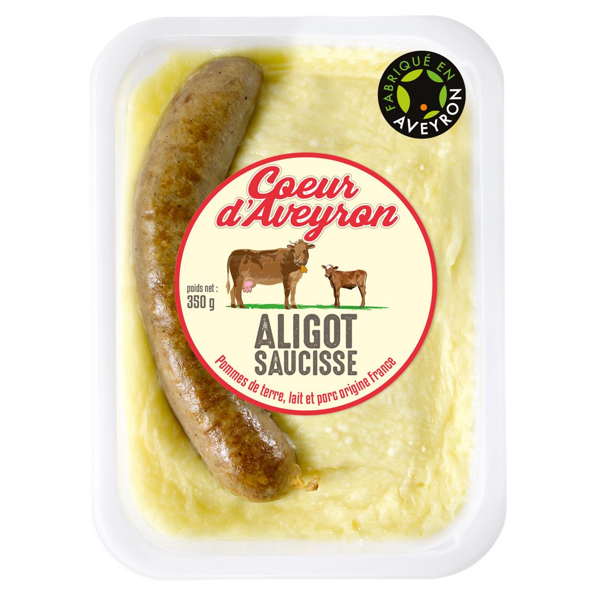 Aligot 77,1% : Pommes de terre 37,8%, TOME 24,6% (LAIT), eau, CRÈME, sel, ail déshydraté. Saucisse 22,9% : Viande de porc 21,5%, eau, sel, dextrose, poivre noir, boyau naturel de porc.