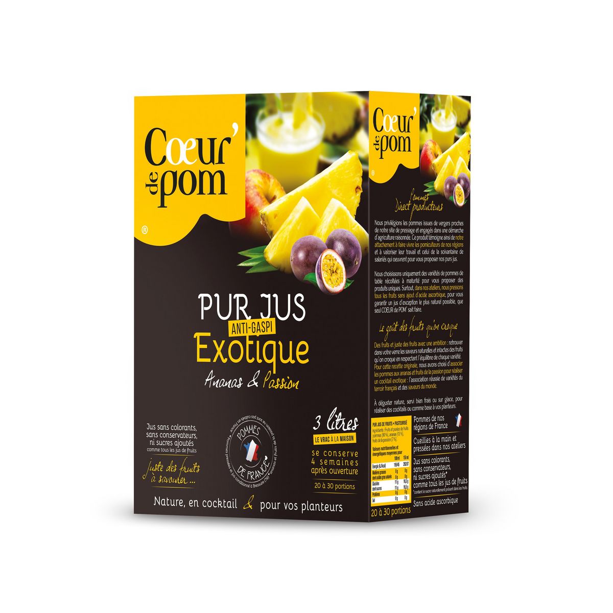Pur jus élaboré à partir de plusieurs variétés de pommes de table, d'ananas et de fruits de la passion. Pommes de France, récoltées à la main et pressées dans nos ateliers. Sans sucres ajoutés et sans sulfites, le Bag In Box permet de conserver le jus 4 semaines après ouverture.