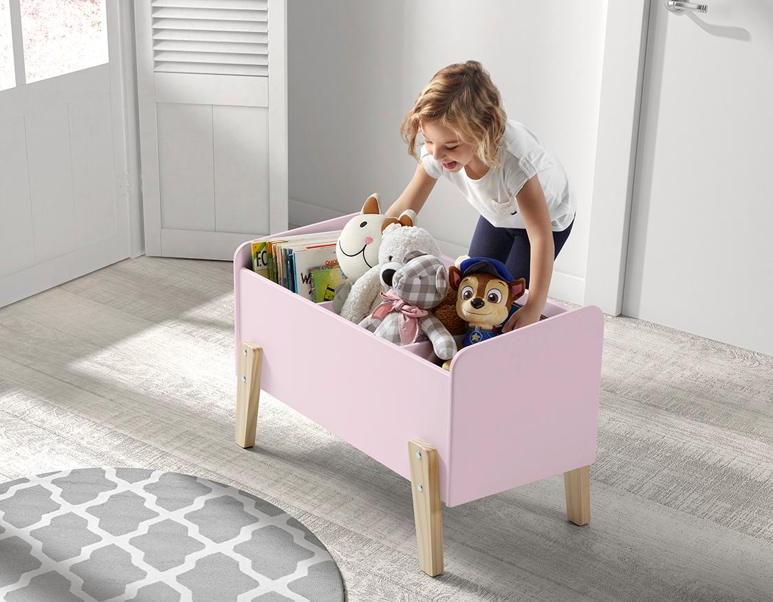 Un coffre à jouets pour votre enfant, pratique et joli ! Idéal pour y ranger peluche, livres ou ce qu'il lui plaira! Ce coffre dispose de 3 compartiments. Association du rose et pieds en bois pin massif tendance et parfait dans une chambre d'enfant au style épuré !