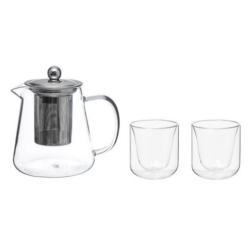 Informations Techniques : Dimensions : Théière : L. 14,5 x l. 10 x H. 13,2 cm Tasses : D. 8 x H. 9 cm Matières : Verre & Acier Inoxydable Spécificités : Pratique & Moderne 1 Théière 2 Tasses Facile d'Entretien & d'Utilisation Poids : 0,338 kg Théière : 0,221 kg Tasse : 0,117 kg Couleur : Transparen