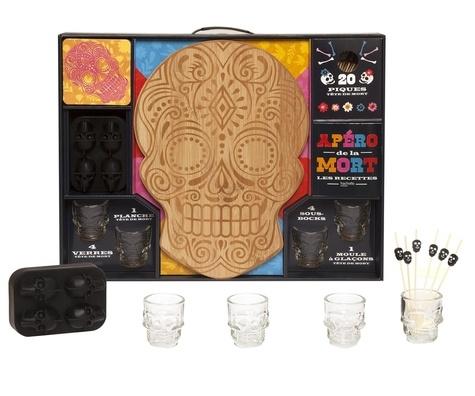 Réveillez vos apéros avec l'apéro de la mort ! Ce coffret comprend : 1 planche en bois gravée en forme de tête de mort , 4 verres tête de mort , 4 sous-bock décorés , 1 moule à glaçons tête de mort , 20 piques pour grignoter , 1 livret de recettes de planche apéro et de cocktails originaux.
