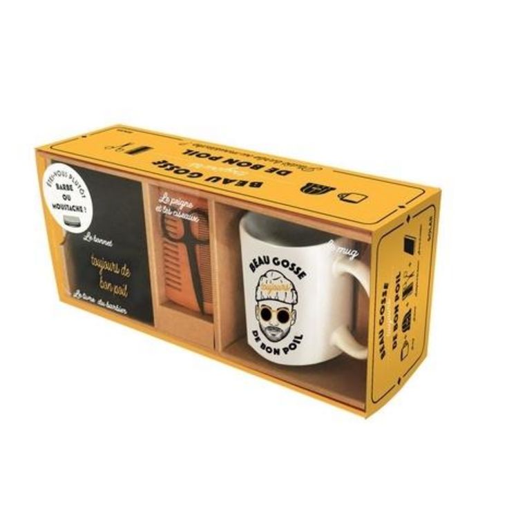 Le coffret pour être un beau gosse à moustache ou à barbe et prendre soin de soi au quotidien, avec un peigne et des ciseaux à barbe, un mug, un bonnet brodé et un livret de barbier ! Dans ce coffret, vous trouverez : un peigne à barbe des ciseaux à barbe ou à moustache un mug à message pour les bea