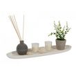 dimensions : l. 52 x l. 19 x h. 12 cm matières : mdf, verre, sable & huile spécificités : parfum : ylang-ylang contient : 1 plateau, 1 diffuseur avec bâtons diffuseurs, 2 bougies, fleur artificielle en pot poids : 0,133 kg couleur : blanc