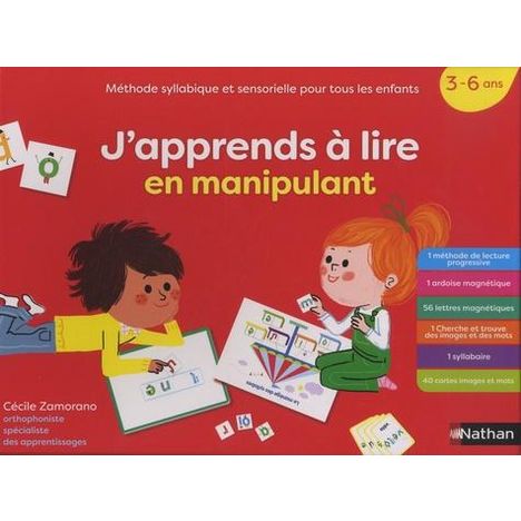 Un coffret proposant une méthode syllabique et sensorielle complète et originale. L'enfant découvre les lettres et le son qu'elles produisent, manipule les syllabes puis forme des mots. Grâce à cette méthode qui sollicite ses capacités visuelles, auditives et corporelles, l'enfant apprend à lire facilement. La méthode est progressive et va des sons les plus simples aux sons les plus complexes. Un coffret complet qui comprend : Un livre méthode de lecture de 96 pages pour apprendre de façon progressive à lire les sons, les syllabes et les mots Une ardoise magnétique et 56 lettres-personnages magnétiques pour réaliser les activités de lecture indiquées dans la méthode Un syllabaire ludique pour composer les syllabes à l'aide des lettres-personnages Un jeu de Cherche et trouve : l'enfant retrouve les sons appris en les identifiant à des images ou à des mots 40 cartes images et mots pour prolonger son apprentissage de la lecture de façon ludique composé d'une méthode de lecture, d'une ardoise magnétique, de lettres-personnages magnétiques, de 2 planches et de 40 cartes images et mots.