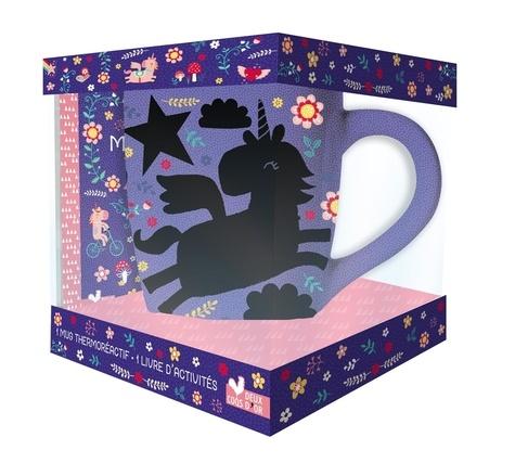 Un coffret cadeau contenant une tasse licorne, un carnet d'activités de 48 pages ainsi qu'une planche de stickers. Lorsque la tasse contient un liquide chaud, l'illustration se métamorphose comme par magie pour reprendre son apparence initiale une fois refroidie ! Grâce au carnet d'activités, l'enfa