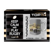 En savoir +Le coffret Rugby Top 14 est composé d'un Mug, d'un stylo ainsi que d'un notebook où figurent tes rugbymans préférés ! Ce coffret est idéal pour décorer le bureau ou pour offrir.