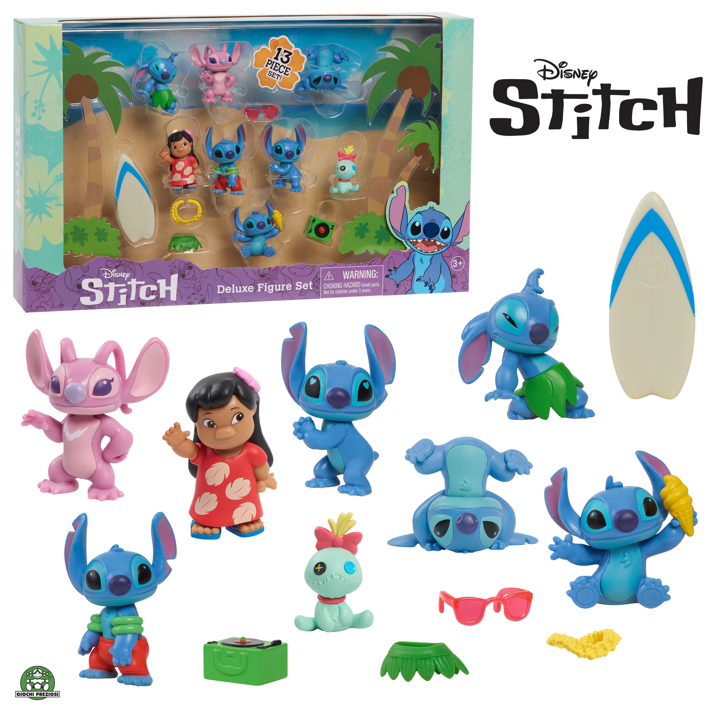 Contient 13 pièces issues de l'univers de Disney Stitch : 7 figurines 5 cm et 6 accessoires.