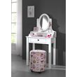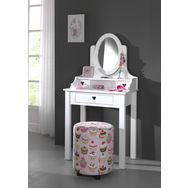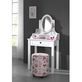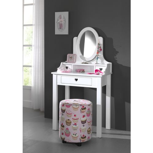 La coiffeuse Maude dispose d'un grand tiroir et 2 petits tiroirs ornés d'un petit motif cœur lui donnant un aspect romantique. Le miroir ovale vient compléter cette jolie coiffeuse et a l'avantage d'être mobile afin de l'orienter comme bon vous semble. Ce meuble en MDF blanc a la finition blanc laquée, sera intemporelle et facilement associable dans une chambre.
