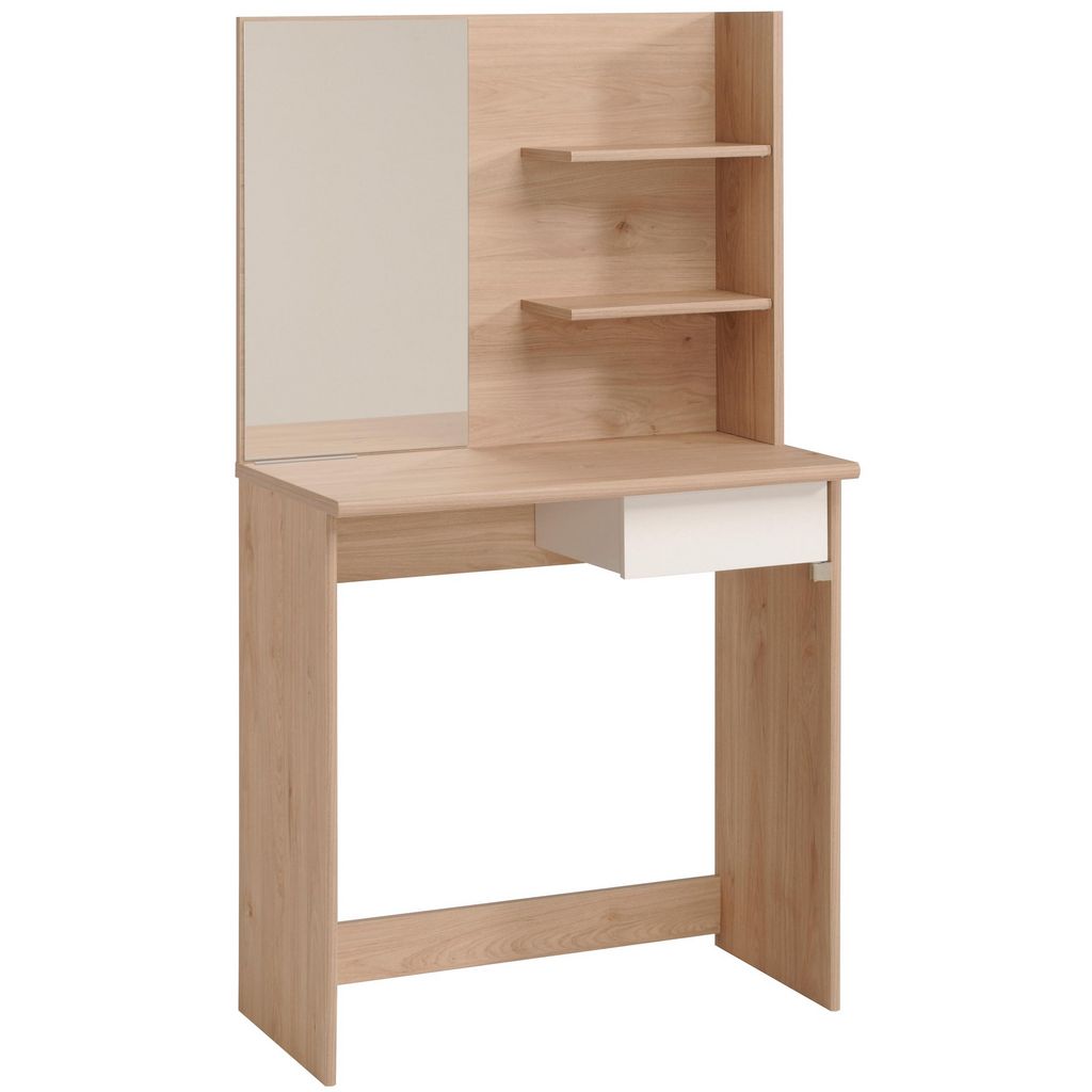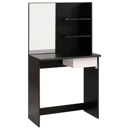 Découvrez la coiffeuse avec tiroir pivotant BEAUTY et sa structure en panneaux de particules. Sur la partie haute, profitez de son grand miroir de 62cm de hauteur et de 2 tablettes à portée de main pour déposer vos objets personnels. Sur la partie basse, retrouvez un tiroir pivotant jusqu'à 135° avec 4 compartiments pour organiser et ranger idéalement tous vos accessoires de beauté. Grâce à son support pour tenir vos smartphones ou tablettes, les tutoriels beauté n'auront plus de secrets pour vous ! La coiffeuse sera en parfaite harmonie avec votre chambre grâce à son design élégant en noir et blanc.