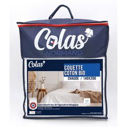 Couette chaude en coton BIO 400 g/m², coton blanchi issu de l'agriculture biologique. Enveloppe : 100% coton bio et garnissage : 100% polyester creux siliconé. Fabrication française.