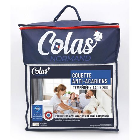 Couette tempérée en polyester SANITIZED 300 g/m² à protection anti acariens et anti bactériens. Enveloppe microfibre 100% polyester et garnissage 100% polyester creux siliconé.