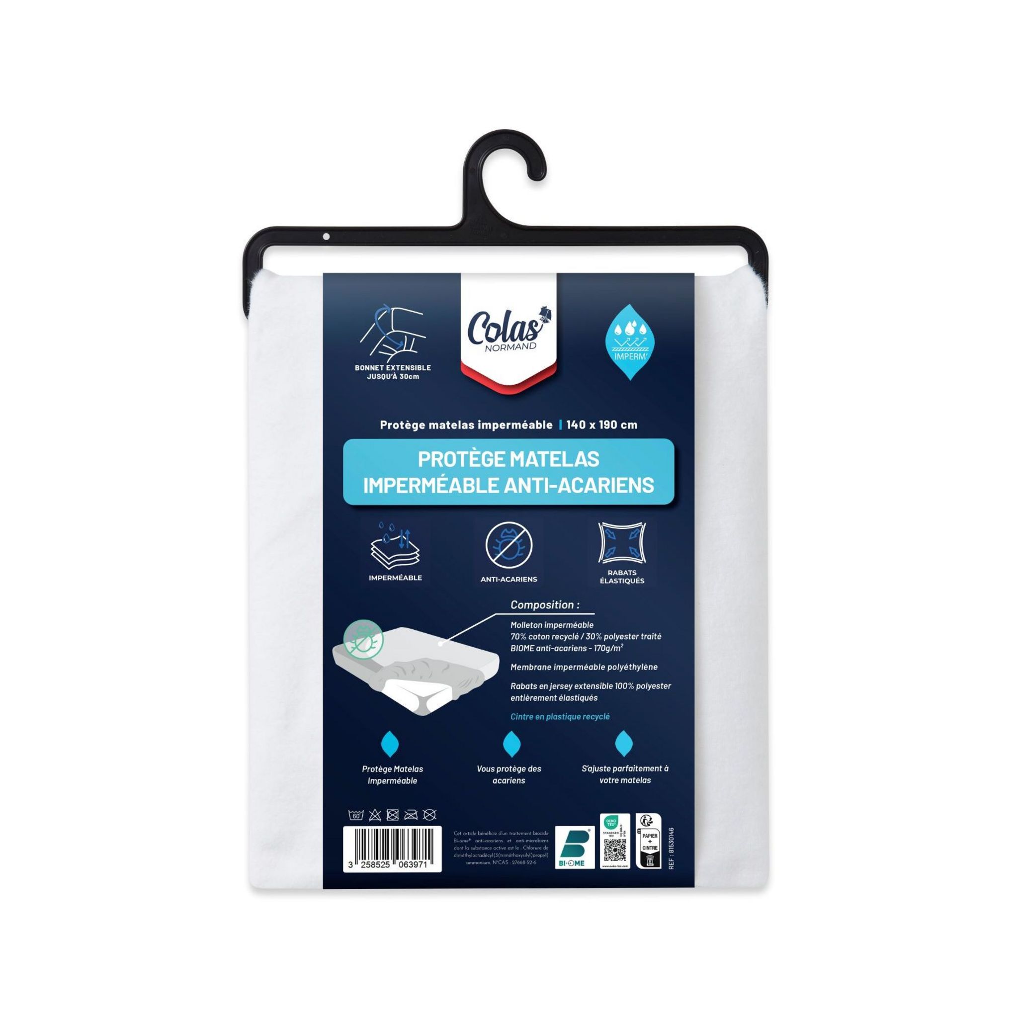 MOLLETON IMPERMÉABLE 70% COTON RECYCLÉ 30% POLYESTER TRAITÉ ANTI-ACARIENS BIOME / MEMBRANE EN POLYÉTHYLÈNE 170GRS/M2 / RABATS EN JERSEY EXTENSIBLES 100% POLYESTER ENTIÈREMENT ÉLASTIQUÉS