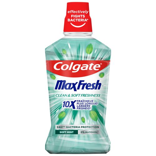 Le bain de bouche Colgate Max Fresh Clean & Soft Freshness vous offre une fraîcheur qui dure 10 fois plus longtemps* grâce à sa technologie FreshFX. *sensation fraîcheur par rapport à un brossage seul.