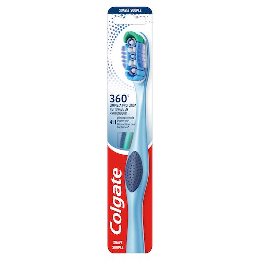 La brosse à dents Colgate 360 Deep Clean nettoie en profondeur en éliminant les bactéries des dents, de la langue, de l’intérieur des joues et des gencives.