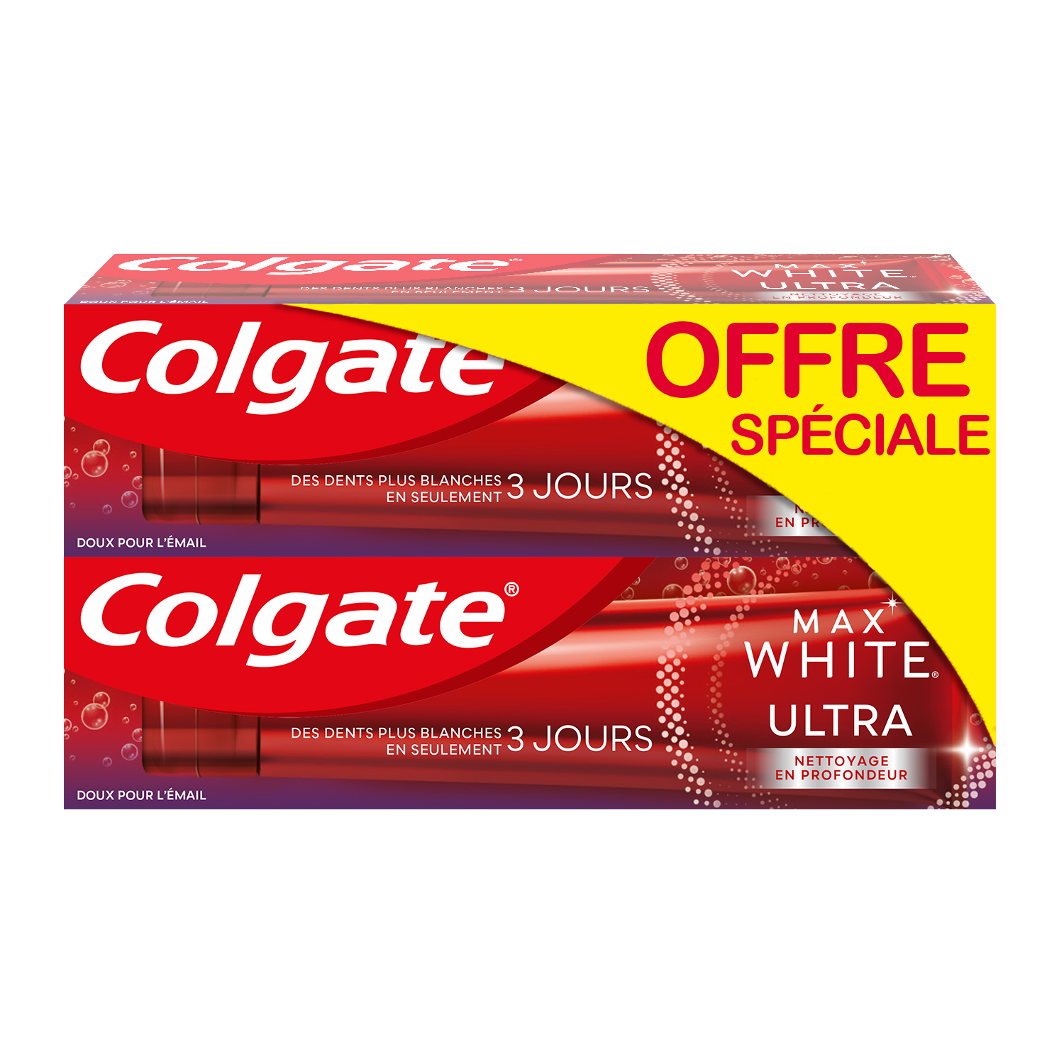 Avec sa technologie à l'oxygène actif révolutionnaire, le dentifrice blancheur Colgate Max White Ultra Nettoyage en profondeur, cliniquement prouvé, rend les dents plus blanches en 3 jours* !