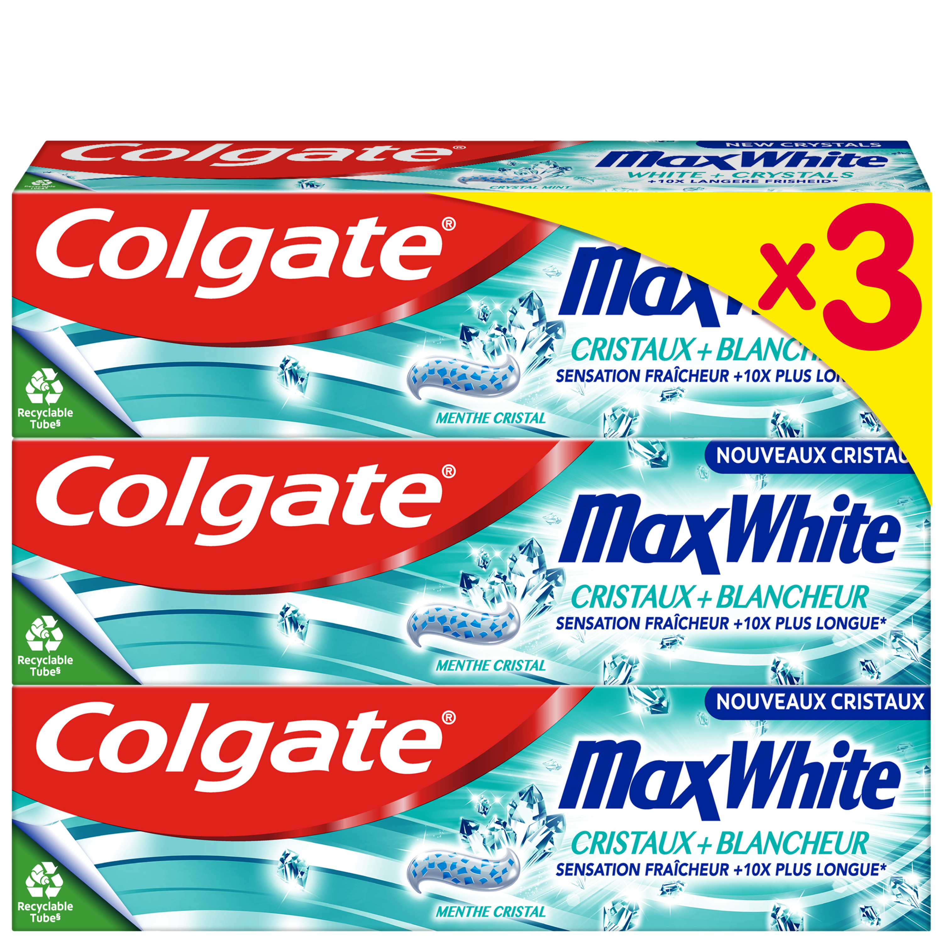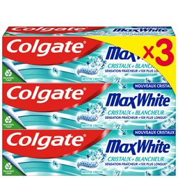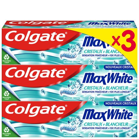 Obtenez une fraîcheur et un blanchiment quotidien avec le dentifrice Colgate Max White + Cristaux. Le dentifrice blanchissant doté de la technologie FreshFX offre une sensation fraîcheur 10 fois plus longue par rapport à un dentifrice au fuor classique.