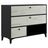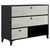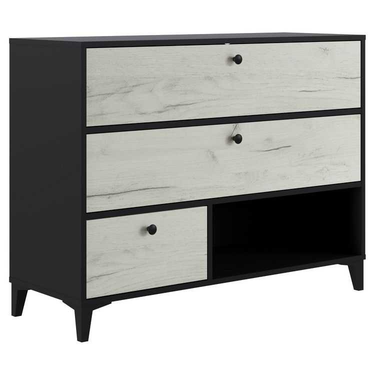 Commode fabriqué en mélamine noir pour le corps du meuble et mélamine chêne blanchi pour les façades des tiroirs. Poignées et pieds en noir. 2 tiroirs large + 1 tiroir petit + 1 niche. Grande capacité de rangement.