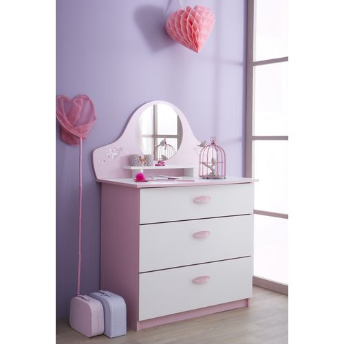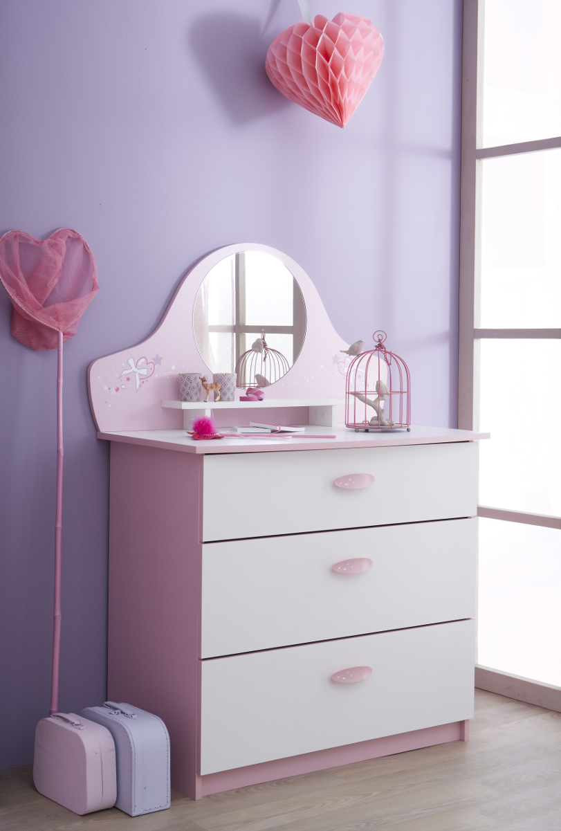 Découvrez la commode BUTTERFLY et son décor original. 3 tiroirs pour bien ranger sa chambre, 1 miroir pour s'en servir comme coiffeuse, elle sera parfaite dans la chambre de votre enfant !