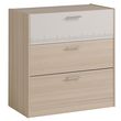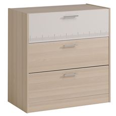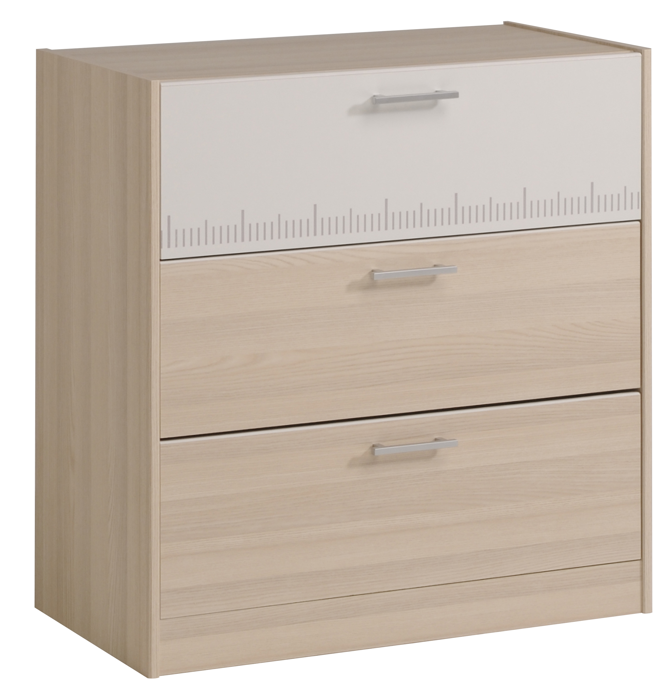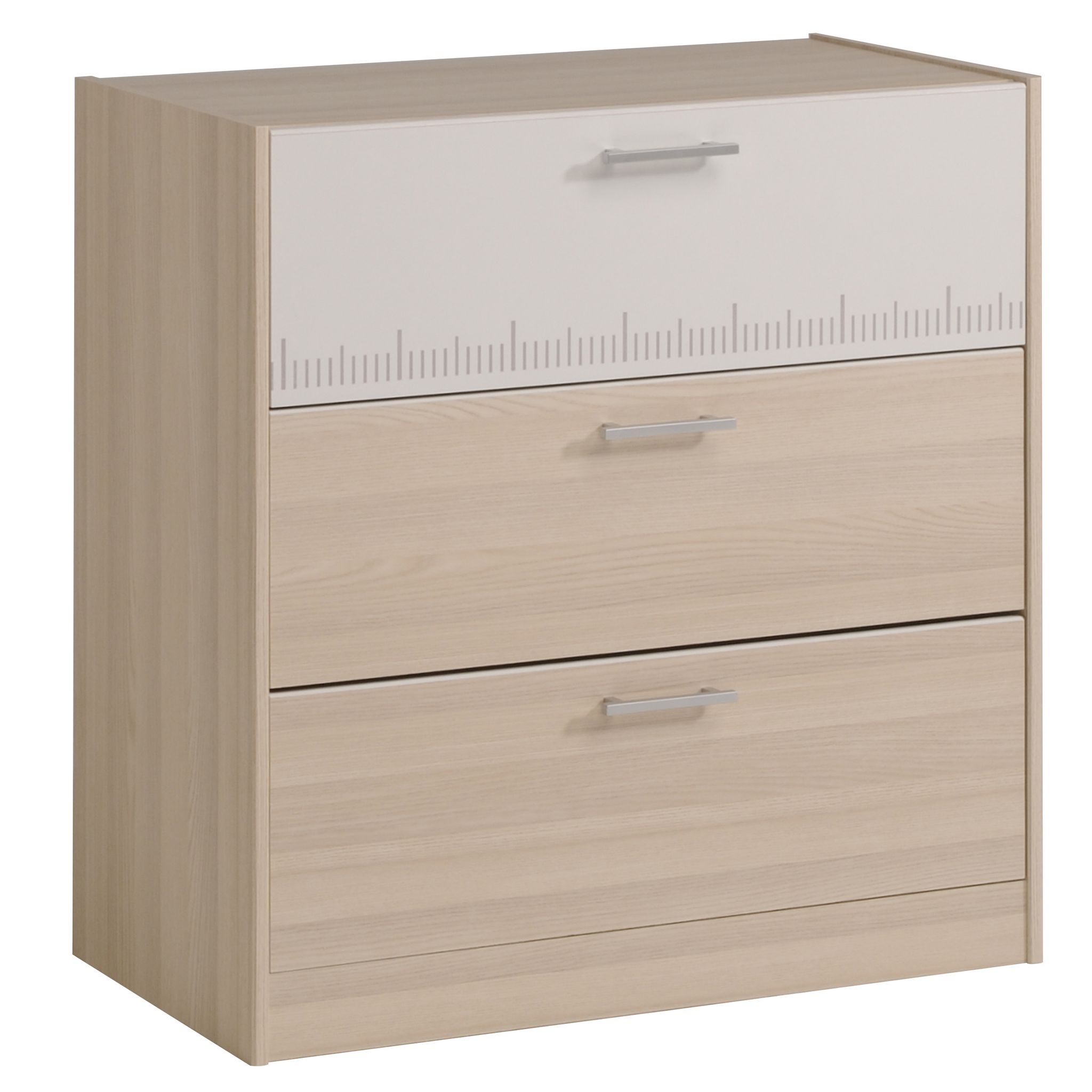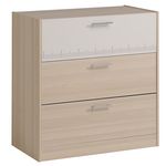 Commode 3 tiroirs avec une structure en panneaux de particules. Coloris acacia clair et blanc.