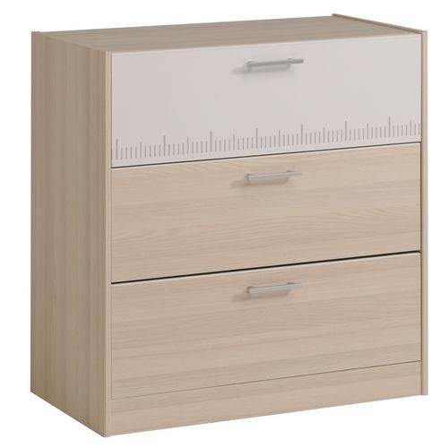 Craquez pour la commode 3 tiroirs pour chambre enfant acacia clair SACHA, qui vous apportera une touche de modernité dans un style naturel. Cette commode aux détails décoprint gris argenté sur le thème des règles graduées pourra être disposée dans la chambre de votre petit en toute simplicité grâce à sa teinte claire et ses lignes épurées. Il est idéal si vous recherchez un grand rangement supplémentaire, en effet il a une belle dimension de L78 x H82 x P40 cm. La structure est en panneaux de particules de 22 mm et 15 mm très solide. 100% Fabrication Made in France, la gamme SACHA propose 10 meubles à prix mini qui conviendront aux filles comme aux garçons.
