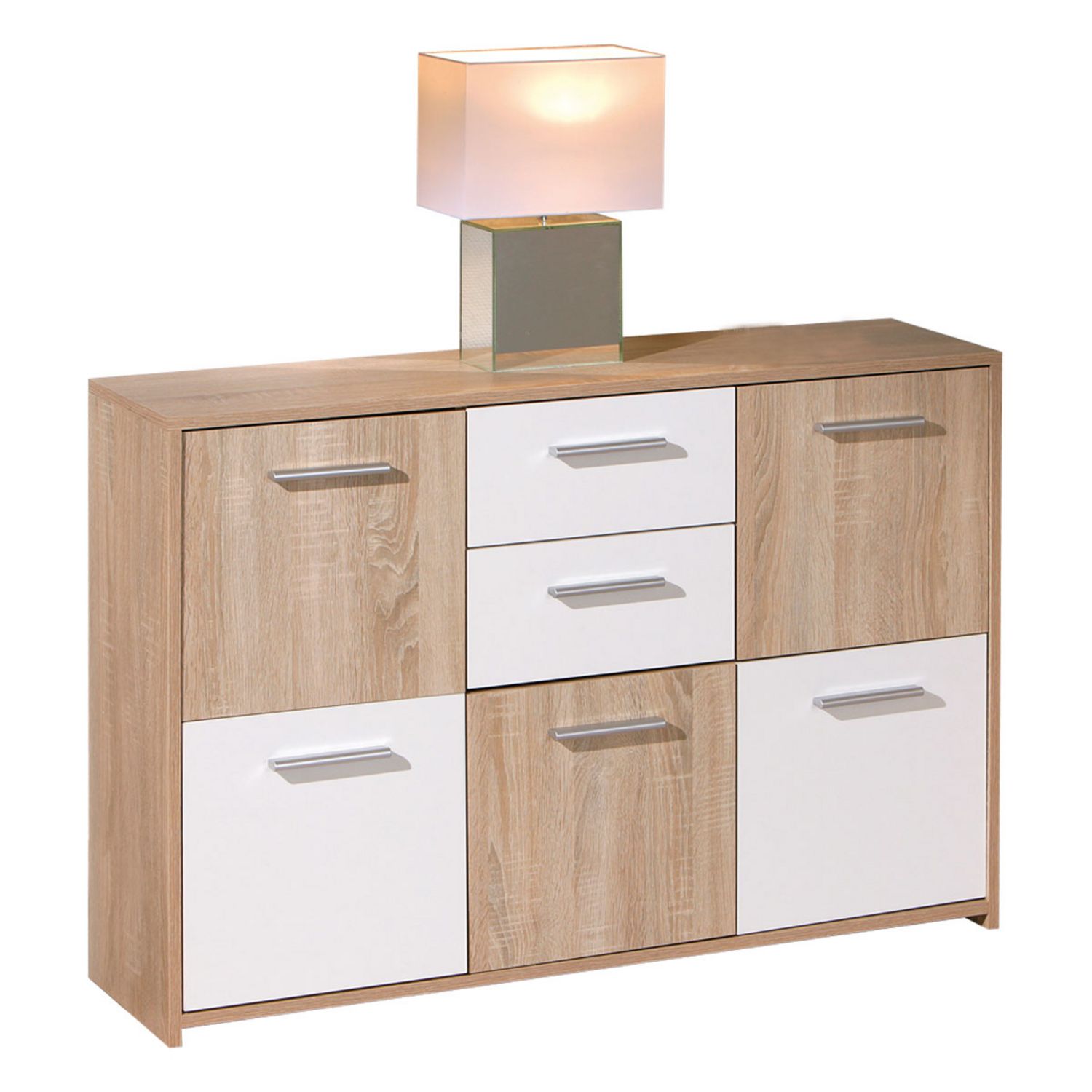 Commode 5 portes - 2 tiroirs couleur chêne clair et blanc.