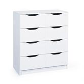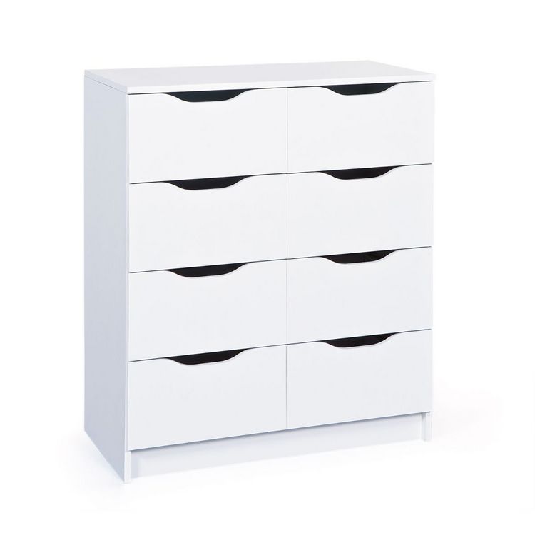 La gamme Falone est composée de plusieurs commodes en panneaux de particules mélaminé robuste blanc. Entretien facile et durable. Encoches pratiques à l’avant du tiroir. Avec 8 tiroirs coulissants.