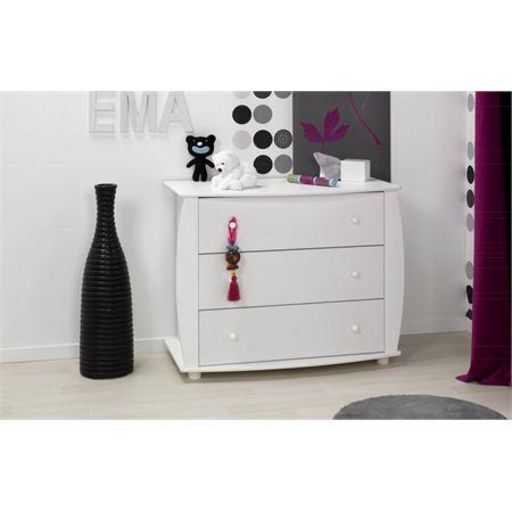 Commode 3 tiroirs WHITE, en panneaux de médium écologique finition peinture à l'eau sans solvants. Elle vous permettra de ranger les affaire de bébé facilement. On aime ses rondeurs et sa simplicité, parfait pour bébé ! Le plan à langer White vendu séparément s'adaptera parfaitement à cette commode.