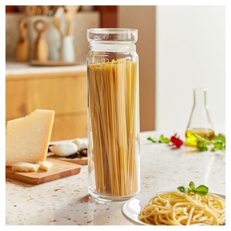 Assez grand pour contenir toute taille de spaghetti ou capellini. En verre transparent avec couvercle hermétique. Très joli